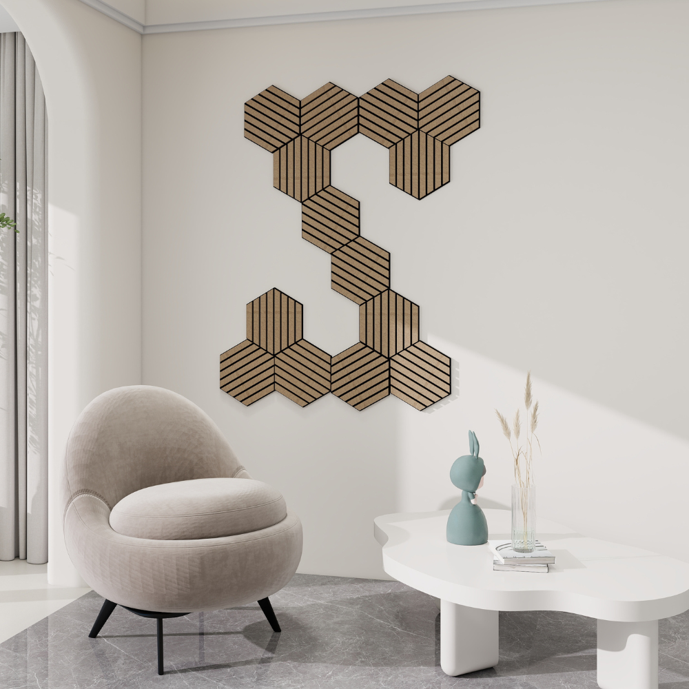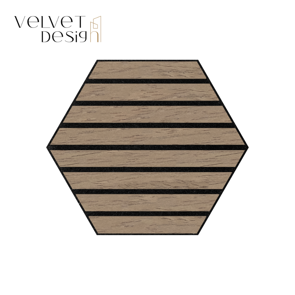 Panou decorativ modular Hexagon 3D, MDF cu furnir natural și fetru PET, atenuare zgomot 80%, Nuc Satinat, 300x260x18mm