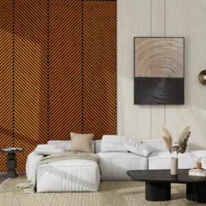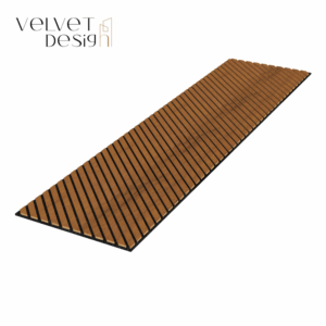 Riflaj decorativ V-Line, panou acustic din lamele MDF si baza fetru PET, design simetric in oglinda, culoare Stejar Caramel, 2400 x 600 x 21 mm, 1.44 mp suprafata acoperita, atenuare zgomot 80% (NRC 0.8), Velvet Design